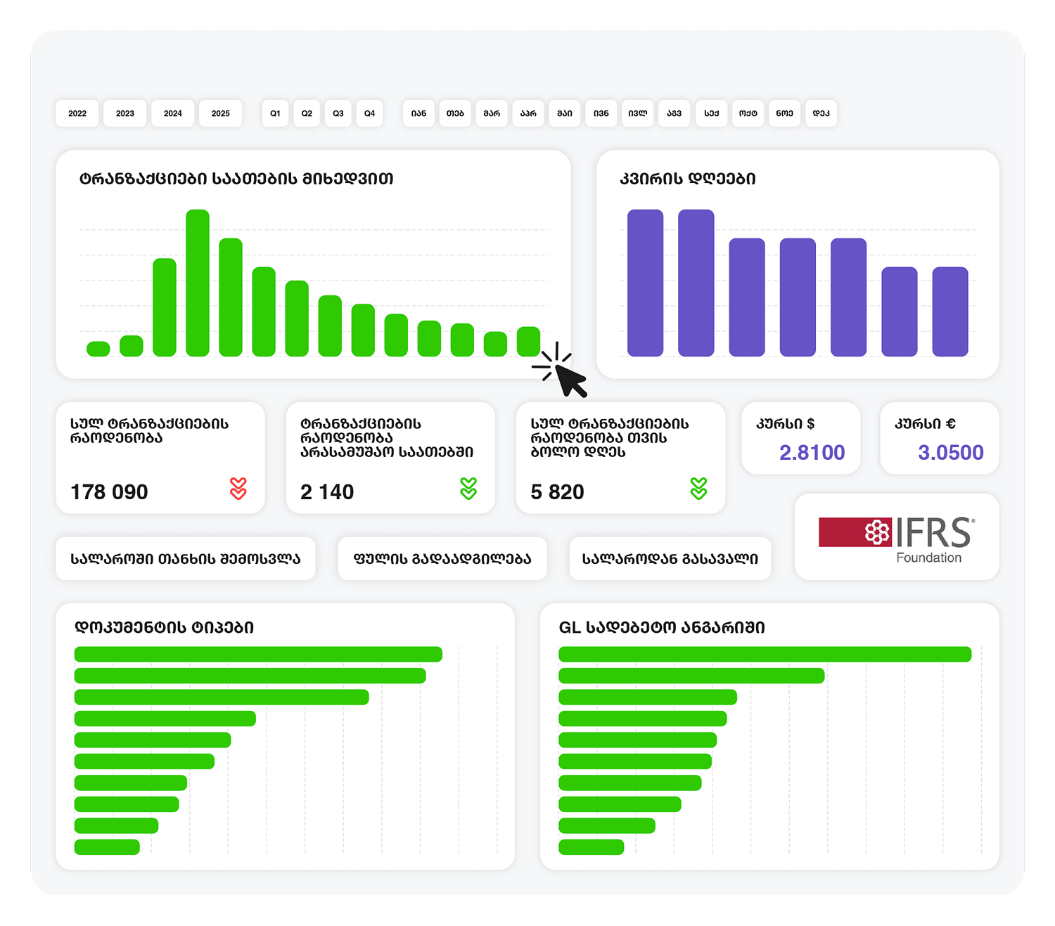 - ბუღალტრული ჩანაწერები სასურველი პერიოდით და დეტალიზაციით