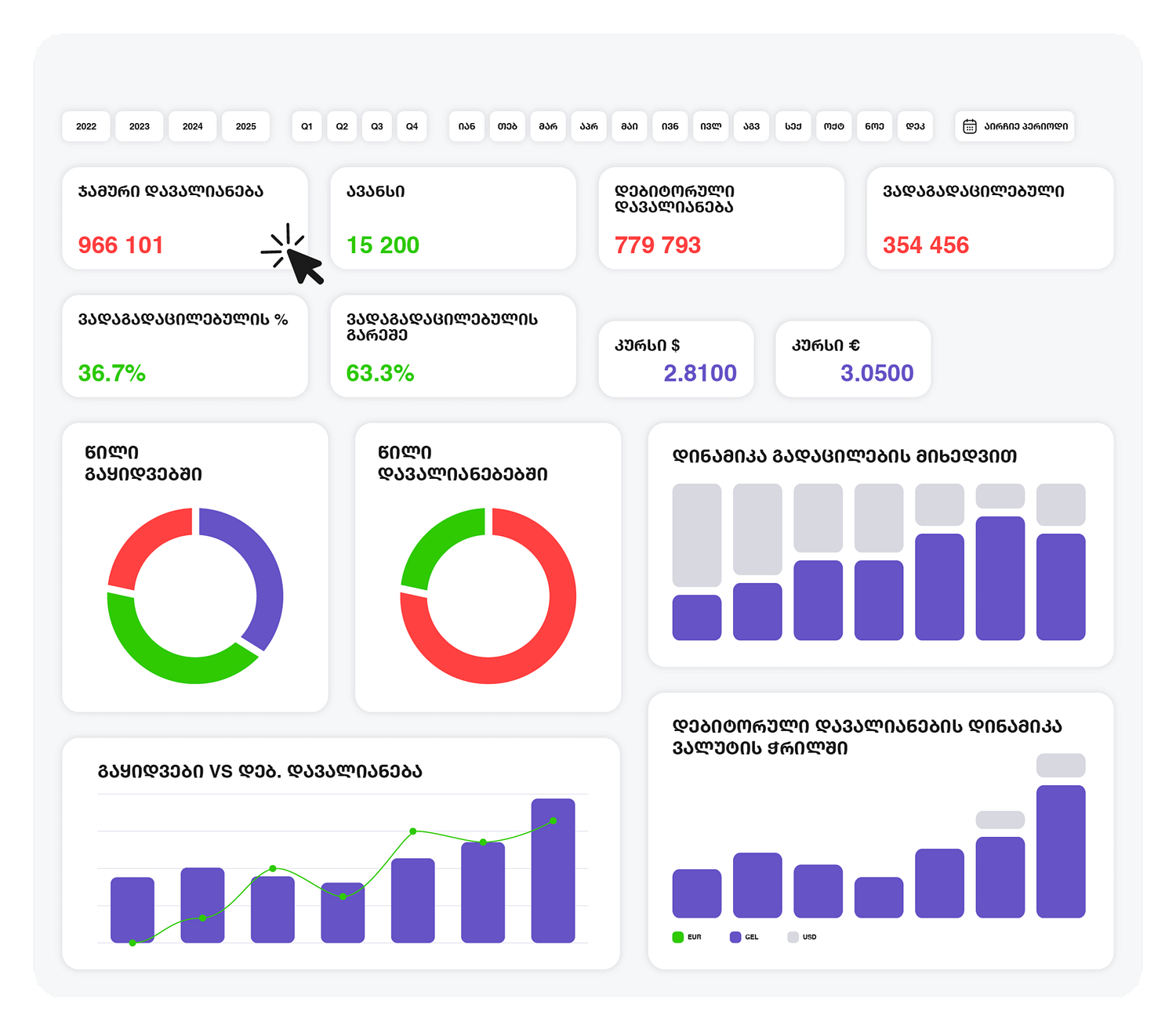 - დებიტორების საერთო სურათი (Overview)მიიღე სრული სურათი პორტფელის მდგომარეობაზე ზედმეტი ცხრილებისა და ძებნის გარეშე.