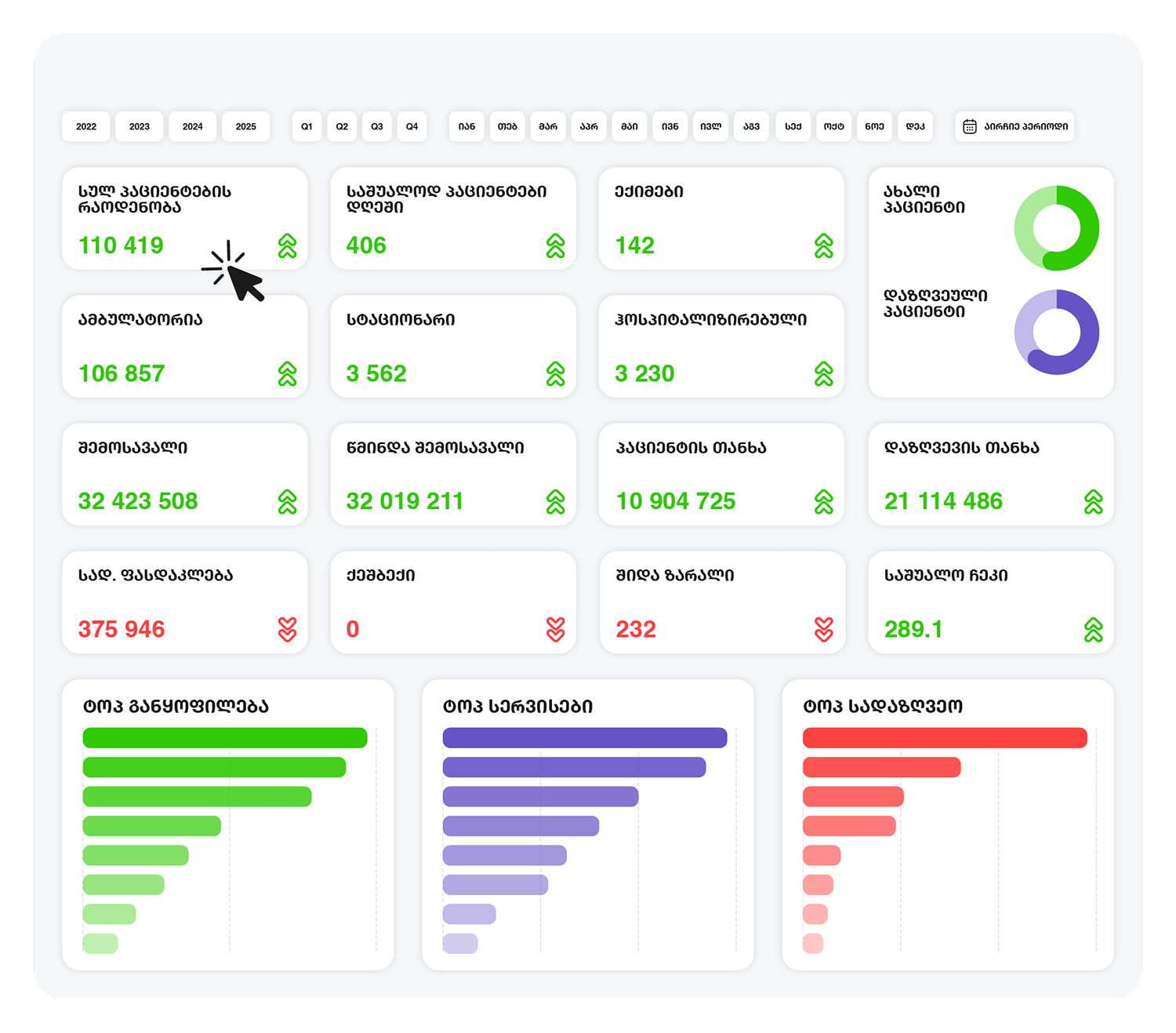 - აკონტროლე მომსახურების ხარისხის KPI-ები ავტომატურადმართე სამედიცინო სტანდარტები რეალურ დროში, რათა უზრუნველყო პაციენტთა მაღალი კმაყოფილება და გუნდის ეფექტური მუშაობა.