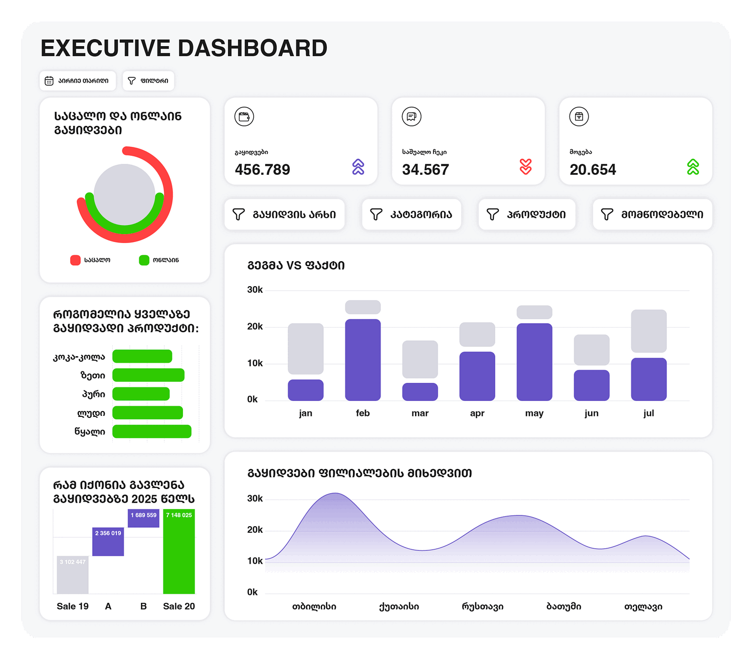ანგარიშები აგებულია ადგილობრივი ფინანსური და რითეილის პრაქტიკის მიხედვით. ყველა დეშბორდი „ლაპარაკობს“ გასაგებ ქართულ ბიზნეს ენაზე, შედეგად იღებ სანდო რიცხვებს, არა რთულ და შენთვის უცხო სისტემას